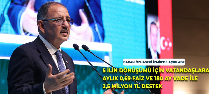 Çevre, Şehircilik ve İklim Değişikliği Bakanlığı, Dünya Bankası ile imzaladığı anlaşma kapsamında İstanbul, İzmir, Manisa, Kahramanmaraş ve Tekirdağ’ın kentsel dönüşümüne büyük bir katkı sunacak olan “İklim ve Afetlere Dayanıklı Şehirler Projesi”ni hayata geçiriyor. Bakan Mehmet Özhaseki, projenin müjdesini İzmir’de verdi. Bakan Özhaseki, 5 ilin dönüşümünü sağlayacak olan proje kapsamında hak sahiplerine aylık yüzde 0,69 faiz ve 180 ay vadeyle 2,5 milyon TL’ye varan kredi desteği verileceğini açıkladı.