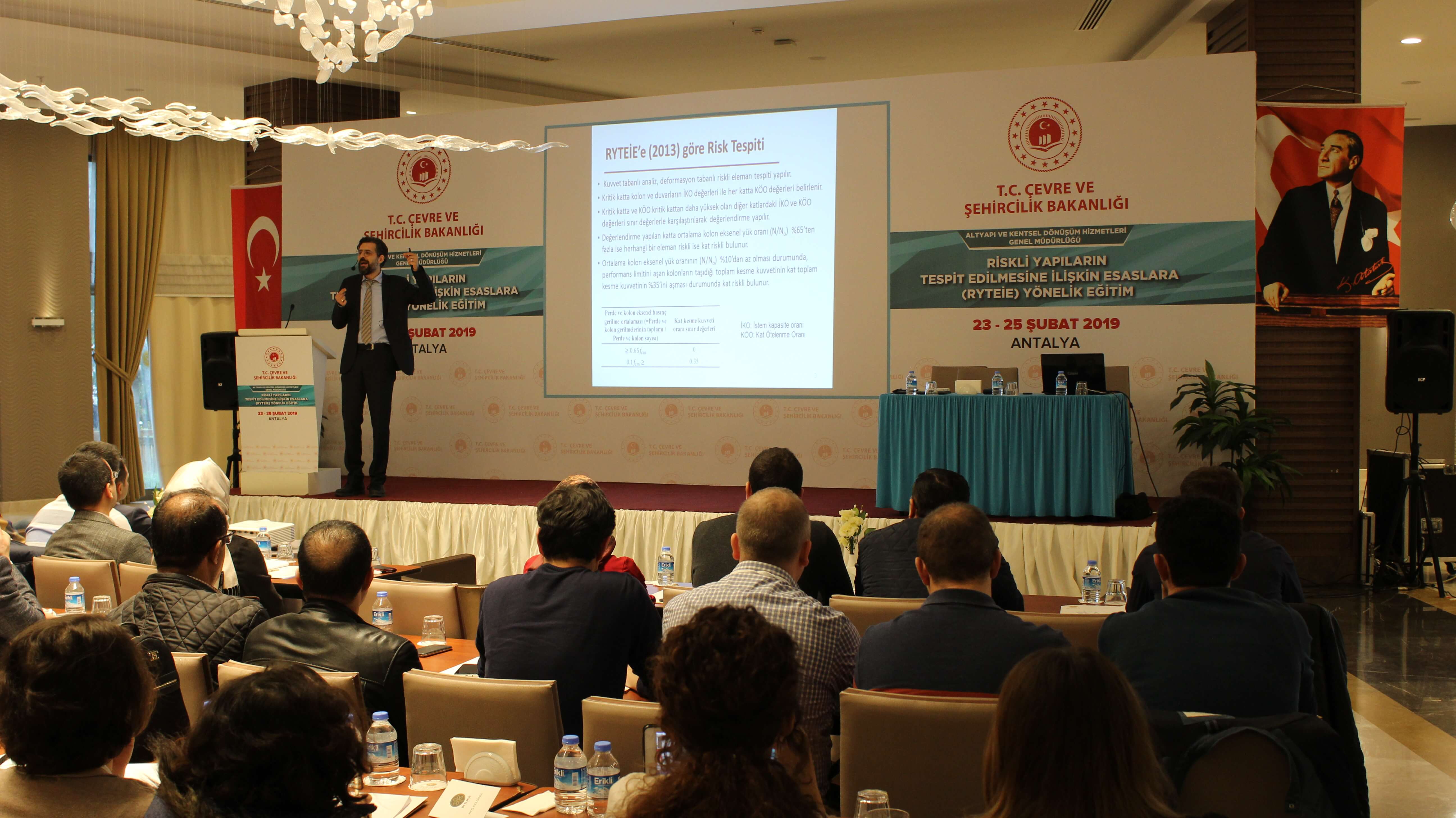23-25 Şubat 2019 tarihleri arasında Genel Müdürlüğümüz ve Eğitim ve Yayın Dairesi Başkanlığı’nın işbirliğiyle, Antalya’da Riskli Yapıların Tespit Edilmesine İlişkin Esaslar’a (RYTEİE) yönelik eğitim programı düzenlenmiştir. Eğitim programına 81 İl Valiliği’nde (Çevre ve Şehircilik İl Müdürlüğü) ve İstanbul 39 İlçe Belediyesinde görev yapmakta olan 260 İnşaat Mühendisi tarafından katılım sağlanmıştır. Eğitim programında, Genel Müdürlüğümüz Riskli Yapılar Dairesi Başkanı Serdar CENİKLİ, İnşaat Mühendislerinden Ali Erhan YILMAZ, Erhan GÜMÜŞ, Mustafa Kemal VARÇİN ile Orta Doğu Teknik Üniversitesi öğretim üyelerinden Prof. Dr. Barış BİNİCİ, Prof. Dr. Ahmet YAKUT, Prof. Dr. Kağan TUNCAY ve Prof. Dr. Erdem CANBAY tarafından eğitime yönelik sunumlar ve anlatımlar gerçekleştirilmiştir.